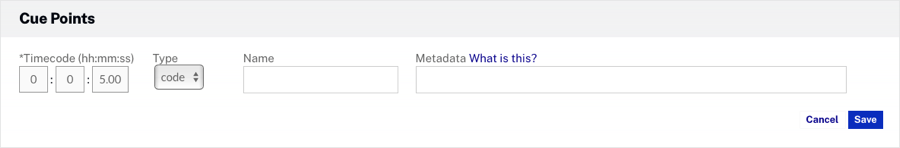- Metadata - Optional metadata that is stored with the cue point. Metadata can be accessed programmatically. One example of when you might want to use a code cue point and pass metadata is when you want to display different calls to action as the video is playing. See the Brightcove Player Sample: Cue Points Display CTA for an example.