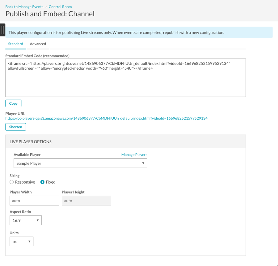 5. プレーヤーの URL をクリックして、ブラウザーでイベントをプレビューするか、使用する適切な埋め込みコードをコピーします。